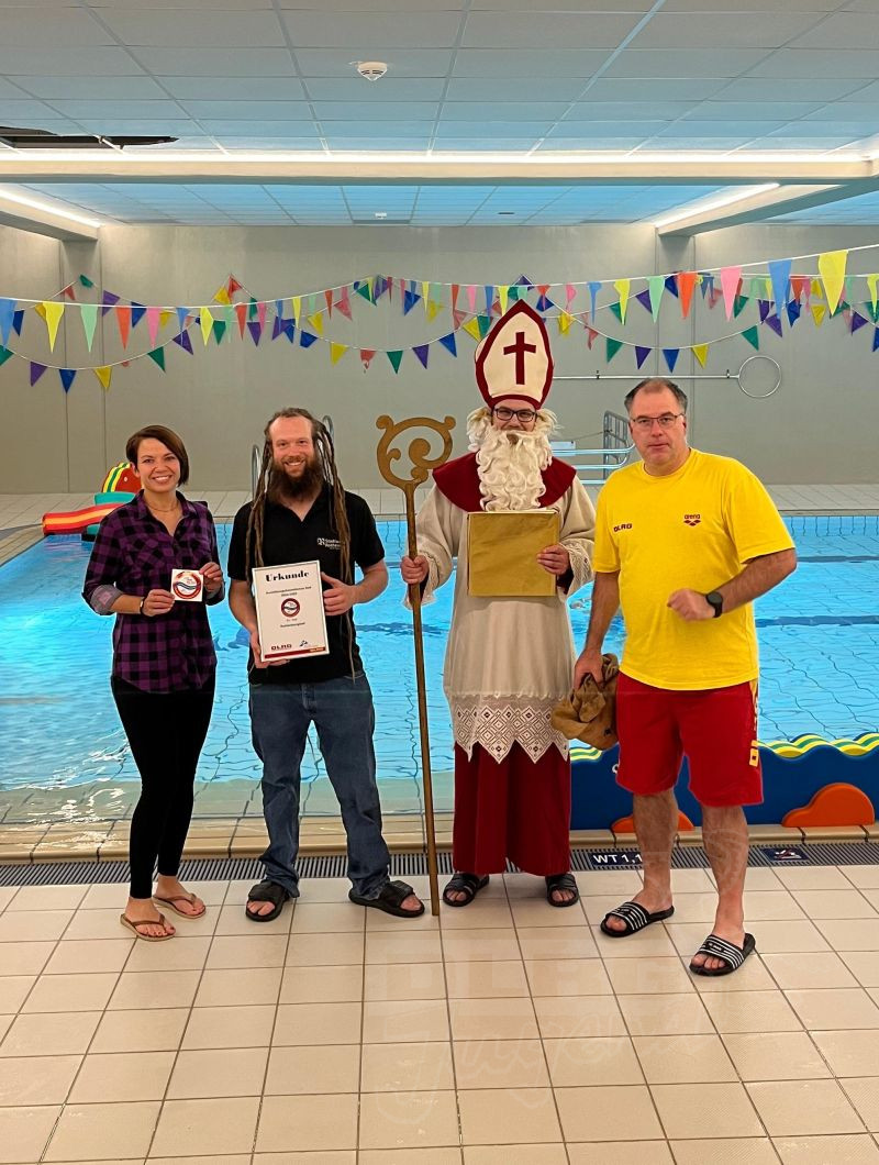 Die Übergabe fand am Montagabend während des Übungsbetriebs der DLRG Niederstetten statt und brachte eine besondere Überraschung: Der Nikolaus kam ins Hallenbad! Begrüßt von den Kindern mit einem Lied, überreichte er nicht nur die Auszeichnung, sondern verteilte auch Schokoladennikoläuse an alle. Beim Übungsabend der DLRG Niederstetten sind regelmäßig rund 100 Kinder und Jugendliche im Wasser, betreut von etwa zehn Riegenführern. Die Ortsgruppe Niederstetten zählt fast 500 Mitglieder und trainiert seit 25 Jahren im Hallenbad Rothenburg, nachdem das Hallenbad in Niederstetten im Jahr 2000 geschlossen wurde. Der Schwerpunkt liegt auf Anfängerschwimmausbildung und Rettungsschwimmsport, bei dem die Ortsgruppe auch an überregionalen und nationalen Wettkämpfen teilnimmt.