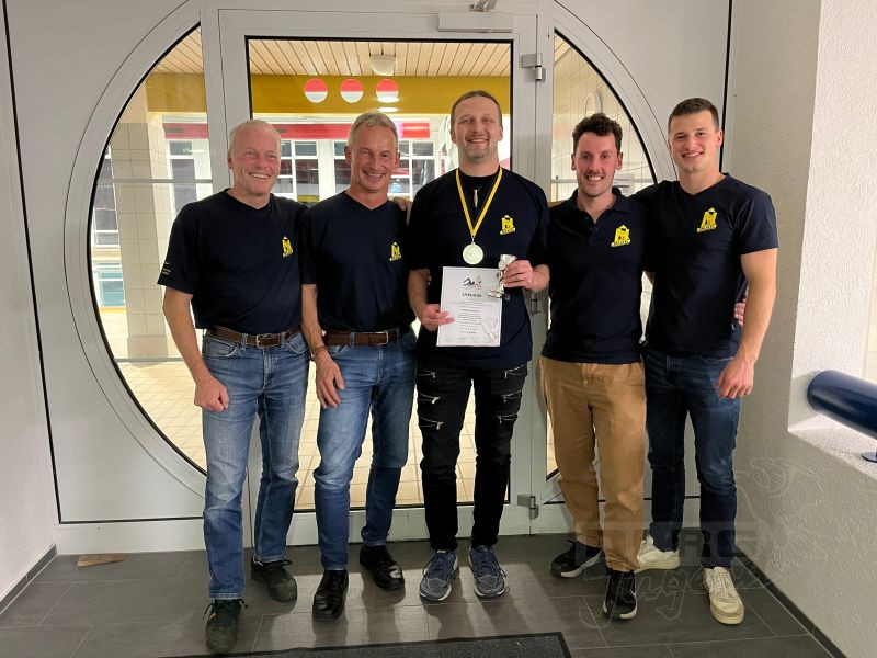 Am Nachmittag trat Murrat gemeinsam mit Jonas Kriese, Jürgen Schmitt, Peter Schmitt und Tim Schmitt im Mannschaftswettbewerb an. In den vier Staffeldisziplinen – je 4×50 Meter Puppenstaffel, Gurtretterstaffel, Rettungsstaffel und Hindernisstaffel – überzeugte das Team mit starken Einzelleistungen und mehreren persönlichen Bestzeiten. In einem leistungsstarken Teilnehmerfeld erreichte die Mannschaft ebenfalls den zweiten Platz in ihrer Altersklasse und sicherte sich damit den zweiten Vize-Landesmeistertitel für die Ortsgruppe.